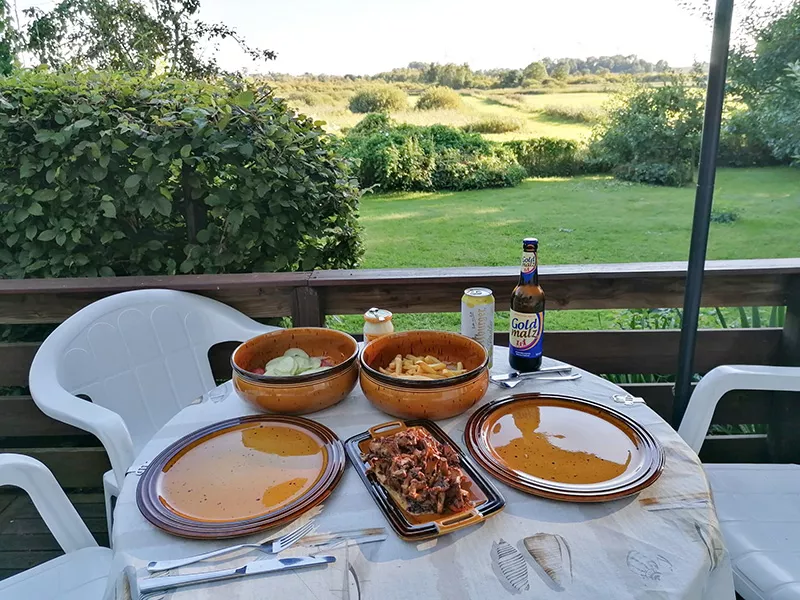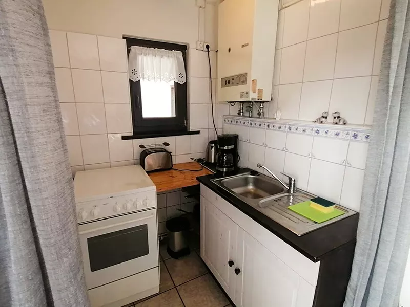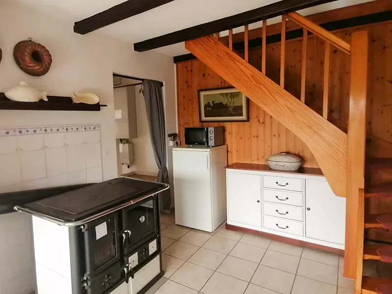 Kochen können Sie auf einem vierflammigen Gasherd oder Sie benutzen den großen Holzofen mit Sichtfenster.